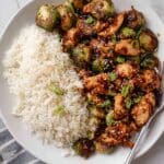 - Serve: Serve the sweet chili chicken and Brussels sprouts hot, optionally with rice, toasted sesame seeds, lime wedges, and extra sweet chili sauce for dipping.