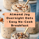 This Almond Joy Overnight Oats recipe is a delicious and nutritious no-cook breakfast option that combines the flavors of rolled oats, almonds, shredded coconut, almond butter, and chocolate chips. Soaked overnight in almond milk, the oats soften to a creamy, pudding-like consistency, perfect for a quick and satisfying morning meal.