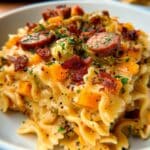 This Autumn Sausage Pasta Squash is a delightful fall favorite that combines roasted butternut squash and Brussels sprouts with smoky sausage and tender bow tie pasta. Ready in just 25 minutes, it’s a comforting, flavorful dish perfect for cozy dinners.