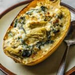 This creamy spinach and artichoke stuffed spaghetti squash is a comforting and healthy twist on a classic dip. Roasted spaghetti squash halves are filled with a rich mixture of cheeses, spinach, and artichokes, then baked until bubbly and golden. It’s a delicious, low-carb meal perfect for any night of the week.