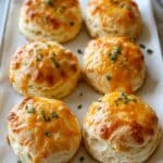Six round golden brown biscuits sit on a white tray lined with white parchment paper, each biscuit topped with melted orange cheese and small green herb pieces scattered on top and around them. The biscuits have a fluffy, soft texture with slightly uneven tops and flaky edges, showing layers inside. The bright melted cheese forms a shiny, slightly crispy layer on each biscuit, contrasting with the light, airy dough below. The scene is set on a white marbled texture surface. Photo taken with an iphone --ar 4:5 --v 7