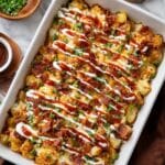 A flavorful Buffalo Chicken Roasted Potato Bake that combines crispy roasted potatoes with tender buffalo-marinated chicken pieces, topped with melted cheddar and Monterey Jack cheeses, smoky bacon, and garnished with green onions and a drizzle of sour cream and buffalo sauce. This hearty casserole delivers a perfect balance of spicy, cheesy, and savory flavors, ideal for a comforting dinner.