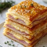 These Puff Pastry Stacks are a delightful and elegant appetizer or snack, featuring layers of flaky puff pastry filled with savory ham, melted cheese, and a hint of Dijon mustard. Perfect for entertaining or a tasty treat, they offer a crispy, golden crust and a warm, gooey center.