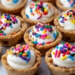 Keywords: cheesecake cookie cups, mini desserts, chocolate chip cookie cups, cream cheese filling, party treats