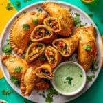 A white round plate filled with several golden-brown samosas, each cut in half to show the colorful filling inside, which includes dark green spinach, orange carrots, and red spices. The samosas are arranged neatly around a small white bowl of light green dipping sauce with fresh cilantro leaves on top. Fresh cilantro leaves are scattered on the samosas and around the plate. The plate is sitting on a white marbled surface, and in the background, there are two small yellow caps and a partially visible drink. Photo taken with an iphone --ar 4:5 --v 7