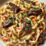 This dish is best enjoyed fresh but can be stored in an airtight container in the refrigerator for up to 2 days. To reheat, warm gently in a skillet over medium heat, adding a splash of water or butter to refresh the sauce. Avoid microwaving to maintain the texture of the steak and pasta.