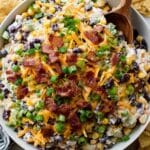 - Garnish and serve: Sprinkle chopped green onion on top for garnish. Serve the dip with tortilla chips or crackers. Optionally, you can warm the dip slightly before serving to enjoy the cheese in a gooey, melted state.