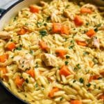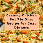 Keywords: Chicken pot pie orzo, creamy chicken pasta, comfort food, one pan meal, stovetop dinner, creamy chicken recipe, orzo pasta recipes