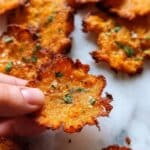 The image shows several crispy, golden-brown chips with a rough texture and small bits of green herbs sprinkled on top. Each chip has an uneven shape with some darker spots indicating a well-cooked finish, and the surface looks slightly oily with a crunchy appearance. In the foreground, a woman's hand is holding one chip close to the camera, emphasizing its texture and color. The chips lie on a white marbled surface that highlights their bright orange and reddish hues. photo taken with an iphone --ar 4:5 --v 7