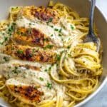 A white bowl filled with creamy chicken Alfredo pasta, featuring two golden-brown, grilled chicken breasts on top of a nest of spaghetti coated in rich white Alfredo sauce, sprinkled with chopped green parsley and cracked black pepper. A silver fork is twirling some pasta near the edge of the bowl, all set on a white marbled surface. Photo taken with an iphone --ar 4:5 --v 7