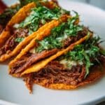 Store leftover birria beef and sauce in an airtight container in the refrigerator for up to 3 days. Freeze the beef mixture separately from tortillas for up to 3 months using freezer-safe containers or bags. Reheat tacos in the oven at 350°F (175°C) for 10-15 minutes, or in a skillet over medium heat until warmed and crispy. You can also microwave them covered with a damp paper towel for 30 seconds to 1 minute.