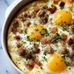 A close-up of a white bowl filled with a baked egg dish showing four bright yellow egg yolks on top, each surrounded by soft, light cream-colored cooked egg whites forming a smooth base layer. Scattered across are light brown sausage pieces and small crispy bacon bits adding texture and contrast. The dish is sprinkled with finely chopped green herbs and black pepper, adding color and detail to the surface. The bowl rests on a white marbled texture, giving a clean and bright look. photo taken with an iphone --ar 4:5 --v 7