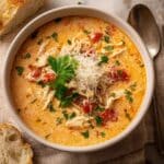 A warm, comforting Crock Pot Creamy Chicken Parmesan Soup packed with tender chicken, a velvety tomato-based broth, and rich Parmesan cheese, perfect for cozy dinners or meal prep.