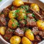 This Crockpot Garlic Butter Beef Tips and Potatoes recipe is a comforting, flavorful meal perfect for busy days. Tender beef and baby potatoes slow-cooked in a rich garlic butter sauce make for an irresistible dish that’s easy to prepare and sure to satisfy.