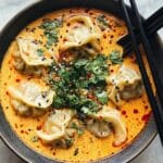 A flavorful and comforting vegan curry dumpling soup made with a fragrant blend of red Thai curry paste, coconut milk, and vegetable broth. This cozy soup features tender cremini mushrooms, vegan dumplings, and aromatic garnishes like chili oil, scallions, crispy garlic, and cilantro. Perfect for a satisfying and warming meal that’s easy to prepare on the stovetop.