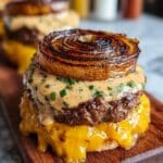 - Assemble the Burgers: Place one caramelized onion slice on a plate, top it with a cheesy burger patty, add a spoonful of the prepared sauce, and cap it off with another onion slice to serve as the top bun. Repeat for all burgers.