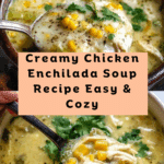 Keywords: enchiladas chicken soup, creamy chicken soup, green enchilada sauce, shredded chicken soup, Mexican chicken soup