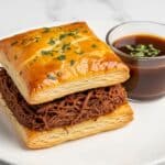 A close-up of a two-layer square savory pastry on a white plate with a glossy golden-brown puff pastry top sprinkled with small green herb pieces. Below the top layer is a thick middle layer of dark brown shredded meat textured with strands, and the bottom layer is a flaky, golden pastry crust. Next to the pastry on the plate is a small cup filled with dark brown sauce, slightly glossy with some herbs floating on top. The background is a white marbled surface. Photo taken with an iphone --ar 4:5 --v 7