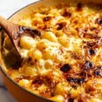 A close-up view of a baking pan filled with a bubbly, golden brown dish made of small round pasta mixed with melted cheese and caramelized onions. The top layer has browned, slightly crispy cheese with a glossy texture and spots of dark char. The pasta pieces are creamy yellow and soft, peeking through the sticky, rich sauce. A wooden spoon is scooping out some of the cheesy pasta from the pan, showing the thick, gooey sauce underneath. The pan is a warm orange color, sitting on a white marbled surface. photo taken with an iphone --ar 4:5 --v 7