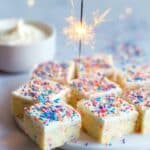 A white plate filled with neatly cut square pieces of a light yellow cake covered with smooth white frosting, each topped with colorful sprinkles in blue, pink, orange, and purple. In the foreground, a sparkler shaped like a star burns brightly, creating small sparks above the cake. To the left, a white bowl of extra frosting sits slightly blurred. The entire scene is set on a white marbled surface with soft lighting that highlights the cake’s texture and the festive sparkler. photo taken with an iphone --ar 4:5 --v 7