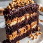 Keywords: chocolate cake, peanut butter cake, chocolate peanut butter dessert, ganache cake, layered cake, creamy peanut butter filling