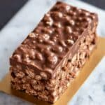 The image shows a single chocolate crispy bar resting on a small golden paper square. The bar has two clear layers: the bottom and middle layer is made of puffed rice mixed with melted milk chocolate, giving it a bumpy, crunchy texture with some air holes visible; the top layer is a smooth, thicker layer of milk chocolate with a glossy finish and small crunchy nut pieces embedded. The background is a white marbled texture, making the rich brown colors of the bar stand out clearly. Photo taken with an iphone --ar 4:5 --v 7