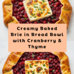An indulgent and elegant appetizer featuring creamy baked Brie nestled inside a crusty bread boule, topped with tangy cranberry sauce and aromatic fresh thyme. Perfect for entertaining or a cozy gathering, this baked Brie bread bowl combines rich flavors and inviting textures in a simple yet impressive dish.