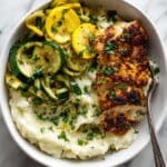 The white bowl holds a meal with three main layers: at the bottom is a smooth layer of creamy mashed potatoes, white and soft with a few green herb bits sprinkled lightly; on top of this lies two pieces of golden-brown grilled chicken breast, showing a crispy, slightly charred texture with flecks of herbs and garlic; next to the chicken, a pile of sautéed green zucchini and yellow squash strips adds a fresh, vibrant green and yellow contrast, with a few slices of cooked yellow squash on top, and a silver fork resting partially on the vegetables. The dish is garnished with chopped green herbs, and the whole scene is set against a white marbled surface. photo taken with an iphone --ar 4:5 --v 7