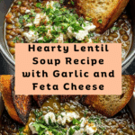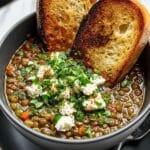 A hearty and flavorful Lentil Soup featuring tender green lentils simmered with aromatic vegetables and herbs, finished with tangy feta cheese and crispy olive oil-toasted bread. This comforting dish is perfect for a nutritious lunch or dinner.