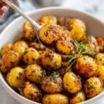 A white bowl filled with small, round roasted potatoes that are golden brown with crispy skins. The potatoes are covered with green herbs and seasoning, giving a fresh and flavorful look. A silver spoon scoops some potatoes from the bowl, held by a woman's hand. The background is a white marbled surface, softly blurred to focus on the potatoes. The photo taken with an iphone --ar 4:5 --v 7