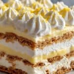 A refreshing, no-bake lemon eclair cake that layers tangy lemon pudding with graham crackers and whipped topping, creating a light and creamy dessert perfect for warm weather or any occasion.