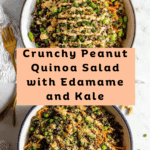 A vibrant and nutritious Peanut Crunch Salad featuring quinoa, edamame, red cabbage, kale, and carrots tossed in a creamy peanut butter dressing. This salad offers a refreshing combination of crunchy textures and bold flavors, perfect as a wholesome lunch or light dinner.