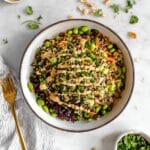 A vibrant and nutritious Peanut Crunch Salad featuring quinoa, edamame, red cabbage, kale, and carrots tossed in a creamy peanut butter dressing. This salad offers a refreshing combination of crunchy textures and bold flavors, perfect as a wholesome lunch or light dinner.