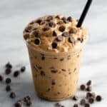 A clear cup filled with a thick, creamy brown mixture, similar to cookie dough, dotted with many dark brown chocolate chips spread evenly throughout. A black straw sticks out from the top right side of the mixture. Around the cup are small clusters of extra chocolate chips scattered on a white marbled surface. photo taken with an iphone --ar 4:5 --v 7