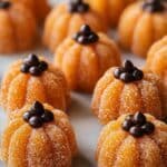 5. Coat and decorate: Roll each ball in granulated sugar to give a sweet, sparkly coating. Optionally, decorate each truffle with a few chocolate chips to mimic pumpkin stems for a charming, festive look.