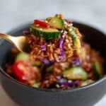 The image shows a close-up of a fork holding a colorful rice and vegetable mix, lifted above a matte black bowl filled with the same dish. The food on the fork has layers of reddish-brown sauced rice, bright green cucumber slices, thin red pepper strips, and purple cabbage, all sprinkled with small white sesame seeds. The bowl below contains more of the mix with visible red tomato pieces on the side, set against a white marbled surface. The fork's color is golden, adding a warm tone to the scene. photo taken with an iphone --ar 4:5 --v 7