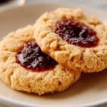 Two round cookies with rough, crumbly edges sit on a white plate on a white marbled surface. Each cookie has a golden-brown base with small visible bits of oats or nuts baked inside. In the center of the top cookie, there is a shiny, deep purple-red jam filling that looks thick and sticky, slightly sunken into the dough. The second cookie is partially covered by the top one, showing more of the crumbly texture and jam center. The lighting is warm and soft, making the cookies look fresh and tempting. Photo taken with an iphone --ar 4:5 --v 7