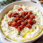 A white bowl holds a creamy layer of soft white cheese spread thickly, topped with a layer of small roasted red cherry tomatoes scattered evenly. The cheese looks smooth and rich with a slight shine from olive oil drizzled over it. Small green herbs are sprinkled on top, adding a fresh touch. The bowl sits on a white marbled surface with blurred cherry tomatoes and green herbs in the background. Photo taken with an iphone --ar 4:5 --v 7