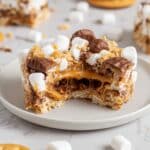 Keywords: Rolo Ritz Marshmallow Treats, no bake dessert, salty sweet treats, marshmallow bars, caramel chocolate treats, easy marshmallow recipe