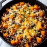 This Southwest Black Bean Skillet is a flavorful and hearty one-pan meal featuring tender sweet potatoes, black beans, and rice simmered in zesty salsa and spices. Topped with melted cheddar cheese, fresh green onions, cilantro, and a squeeze of lime, it’s a vibrant, simple dish perfect for a quick weeknight dinner or cozy meal any time.