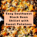 Keywords: Southwest Black Bean Skillet, black beans, sweet potatoes, rice skillet, easy vegetarian dinner, one-pan meal, cheesy rice skillet, southwestern cuisine