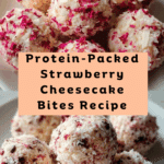 These Strawberry Cheesecake protein balls are a delicious and nutritious snack made with rolled oats, almond flour, vanilla protein powder, cream cheese, and freeze-dried strawberries. Sweetened naturally with honey or maple syrup and flavored with vanilla extract, these no-bake treats are easy to prepare and perfect for a quick energy boost or a healthy dessert option.