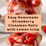 Keywords: strawberry cinnamon rolls, sweet rolls, yeast rolls, breakfast rolls, homemade cinnamon rolls, strawberry filling, lemon icing