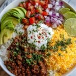 This Taco Rice Bowl is a flavorful and comforting meal combining seasoned ground beef or turkey, fluffy rice, and a medley of fresh and canned vegetables. Perfect for a quick weeknight dinner, it features a satisfying blend of protein, veggies, and melted cheddar cheese topped with salsa and garnished with fresh cilantro and lime wedges for an extra zing.