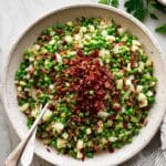 A flavorful Thanksgiving side dish featuring tender peas sautéed with savory pancetta, sweet pears, shallots, and a bright lemon-parsley finish that brings freshness and depth to your holiday table.