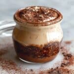 A small clear glass jar with two visible layers: the bottom layer is a dark brown mixture with a chunky texture, while the top layer is smooth and creamy beige, dusted with cocoa powder that also spreads around the jar on a white marbled surface. The rim of the jar has a little cocoa powder and some cream marks, showing a rustic, homemade look. Photo taken with an iphone --ar 4:5 --v 7