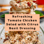A refreshing and flavorful Tomato Chicken Salad featuring shredded chicken mixed with sun dried tomatoes, crunchy celery, and red onion, all tossed in a zesty citrus basil dressing made with Greek yogurt and mayonnaise. Perfect as a light lunch, a sandwich filling, or served with crackers for an easy, healthy meal.