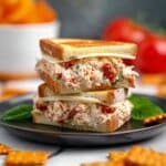 The image shows a two-layer sandwich stacked on a dark plate, placed on a white marbled surface. Each layer is made of thick, toasted bread with a light golden crust. Inside, there is a creamy mix of shredded pinkish tuna combined with small pieces of red sun-dried tomatoes and green herbs. A slice of white melted cheese sits on top of the tuna mix in each layer. A single green leaf peeks out from between the sandwich layers. Around the plate are scattered orange-brown crackers, some whole and some broken. The background is softly blurred with hints of red tomatoes and a white bowl filled with orange chips. photo taken with an iphone --ar 4:5 --v 7