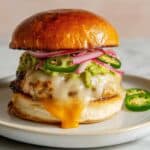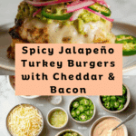 These flavorful turkey burgers feature ground turkey thigh meat mixed with jalapeños, sharp cheddar cheese, and crispy bacon. Grilled to perfection and topped with melted cheddar, chipotle mayo, sliced jalapeños, smashed avocado, and quick pickled onions, they offer a spicy, cheesy twist on a classic favorite, perfect for a tasty and satisfying meal.