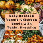 This Veggie-Chickpea Bowl is a nutritious and flavorful plant-based meal featuring roasted chickpeas and mixed vegetables, drizzled with a creamy tahini maple dressing. Perfect for a wholesome lunch or dinner, this recipe combines simple ingredients roasted to tender, caramelized perfection and topped with fresh herbs for a burst of freshness.
